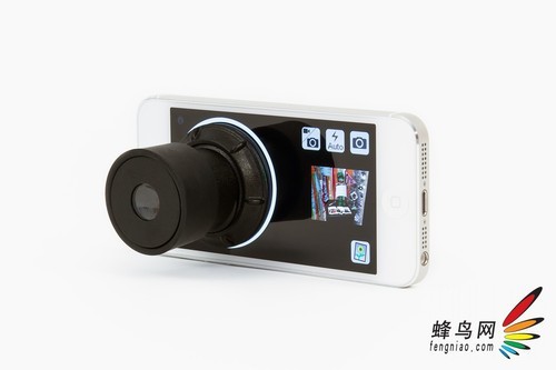 这款手机专用取景器吸附在手机的屏幕上,通过专门的App将手机屏幕变为一个专门的取景画面。取景器内部浏览以EVF的形式显示出目前要拍摄的画面,在取景器外面的屏幕也会显示出目前取景器很现实的取景效果,这样在不使用取景器时,同样可以使用手机完成拍摄。在软件界面上方则是对iPhone相机的控制系统,包括闪灯、拍摄模式以及快门。