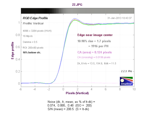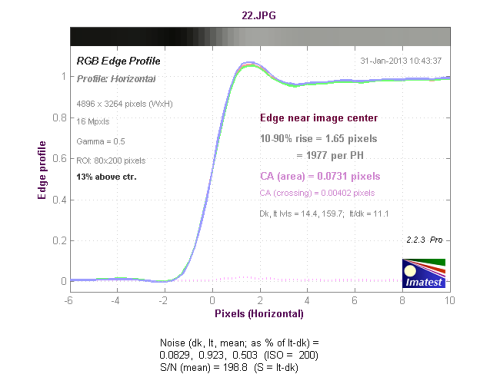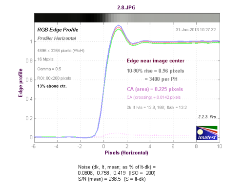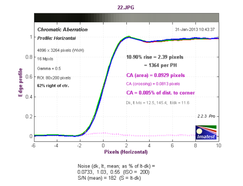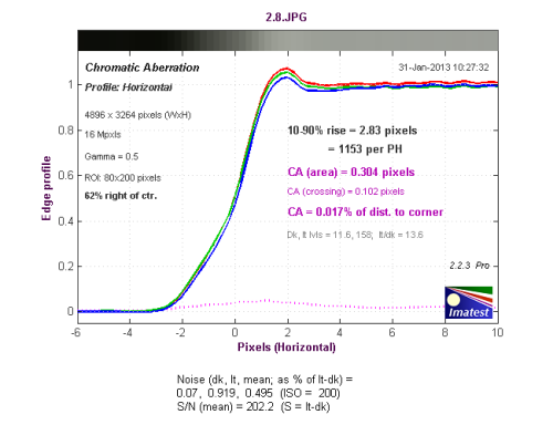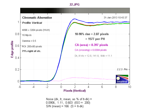 在全开光圈时的镜头中心水平与垂直方向的色散情况来看,水平方向的色散区域为0.225像素,垂直方向的色散区域为0.116像素,色散区域的大小在1个像素以内,一般人的肉眼无法察觉。