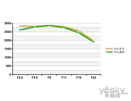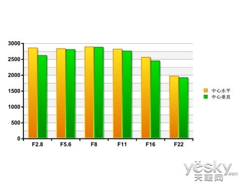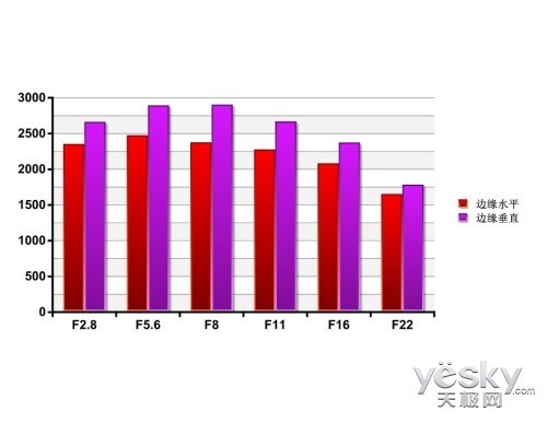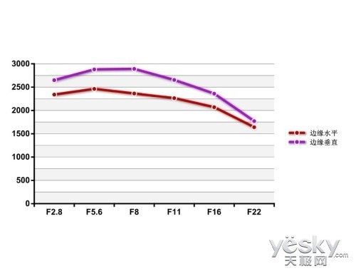 再来看看14mm焦段镜头的边缘测试成绩,在光圈开F5.6时,边缘水平分辨率表现也非常不错。在所有光圈区间内,水平分辨率都已经超过了2000线,从F5.6开始分辨率开始缓慢下调。从测试成绩上可见,峰值出现在F5.6时,说明F5.6为最佳光圈。