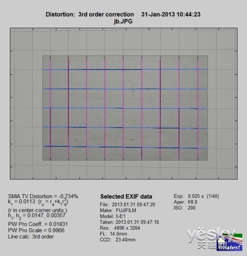 我们现在对富士XF 14mm F2.8 R镜头进行分辨率测试,照例我们使用的是ISO 12233分辨率标版。搭配富士的全新的可换镜头数码相机X-E1。相机设置上,我们选择精细JPEG格式、感光度ISO 200对标版进行拍摄。然后使用Imatest软件来对富士XF 14mm F2.8 R镜头的分辨率进行测试。