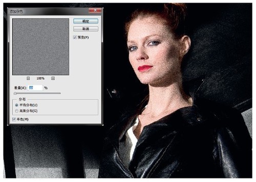 将颗粒图层的混合模式设置为叠加,隐藏原本的中灰色填充。执行“滤镜>杂色>添加杂色”命令,将数量设置为10%,勾选单色选项。单击确定按钮为画面添加杂色。