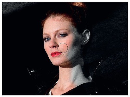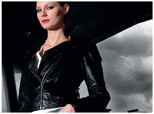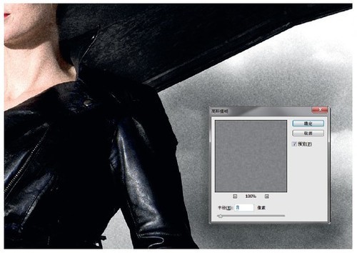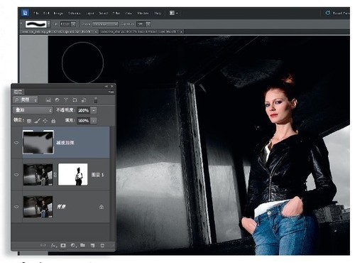 女孩身上的皮夹克阴影太重,为了使其在深色的背景中显得更加突出,我们需要用到工具栏中的减淡工具。将画笔大小设置为125像素,范围中间调,曝光值15%。在女孩的后脑勺和衣领处涂抹,增强对应部分的细节表现。