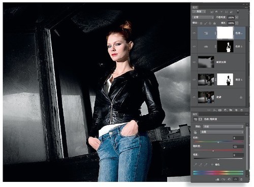 继续使用黑色画笔工具还原人物皮肤、服装等部分的颜色。由于皮夹克本身是黑色,所以在处理这个部分的时候我们只需要注意高光处的反光颜色即可。经过一段时间,整个人物就被还原到了彩色状态。