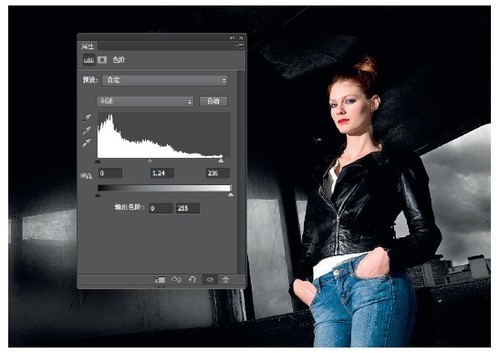 双击色阶调整图层的图层缩略图,打开色阶属性面板。在弹出面板中将直方图下方中间位置的灰色滑块向左移动至1.24提亮女孩身上的中间调部分,将白色滑块向左移动至236加强高光。