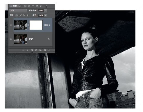 单击“背景 副本”图层将其选中,执行“图像>调整>去色”命令移除画面色彩,得到范例文件的黑白版本。保持图层为选中状态,单击图层面板下方的添加图层蒙板按钮,我们将使用蒙板将下方图层中彩色的主体人物还原为可见。