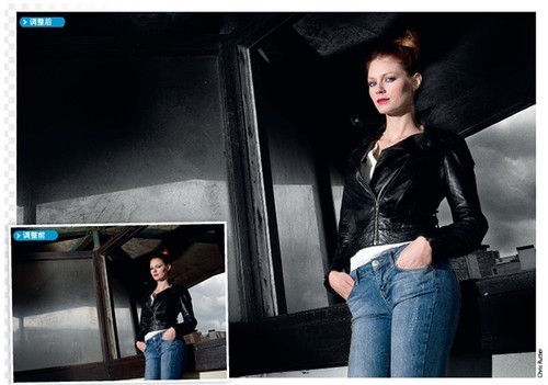 许多光线环境下拍摄的照片,最终色彩表现也许大大不如我们的期待,光线昏暗的多云天就是个很典型的例子。拿用作范例的这幅照片来说,我们靠闪光灯提亮模特,给服装、化妆和皮肤影调带来了较好的色彩表现,但画面其余部分的颜色顶多也就算是意思意思。