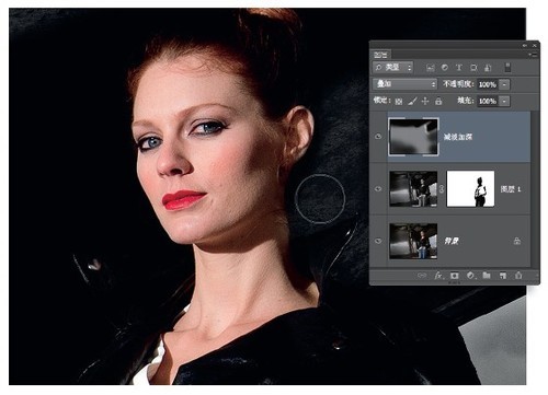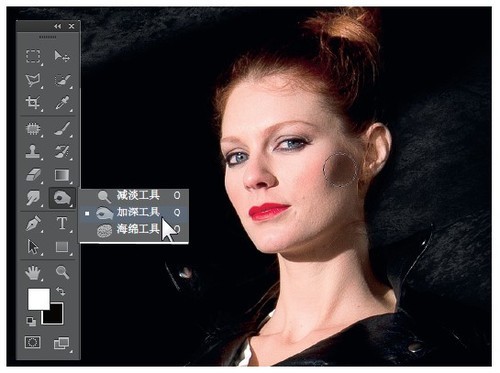 提高面部阴影与高光之间的反差对比能突出人物的面部轮廓,这个操作同样可以使用加深工具完成。选择加深工具,将范围设置为中间调,曝光值15%,使用大小为90像素的画笔在减淡加深图层上的人物面颊阴影处涂抹。