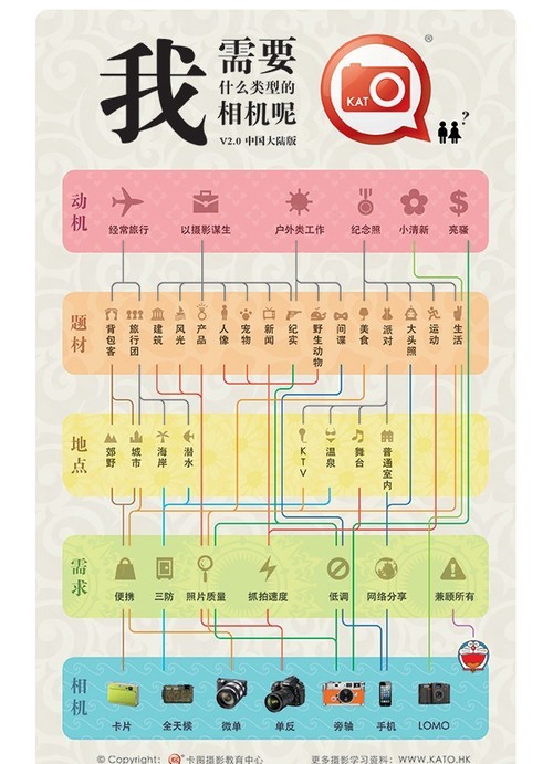 如图所示,它根据拍摄者最基本的需求出发,针对拍摄动机、题材、地点、需求等方面的因素开始进行分析,最终用户可以根据不同因素组合来选择最适合自己的相机。