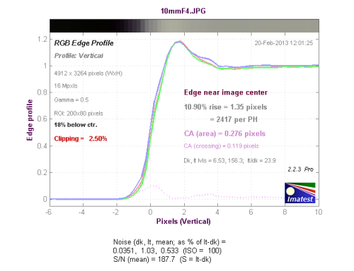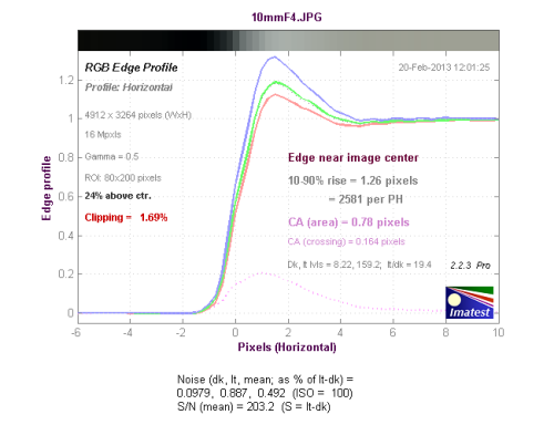 看了我们之前的对镜头的综述分析的朋友应该知道索尼SEL1018镜头使用了1片低色散玻璃镜片,一般来说镜头中低色散玻璃镜片越大越好,越多越好。那我们就一起来看看这款镜头的色散情况到底如何,我们依旧使用Imatest软件镜头的色散进行测试,先从10mm焦段开始。