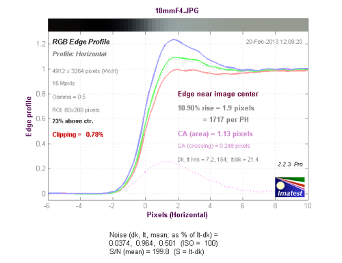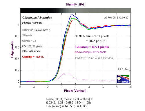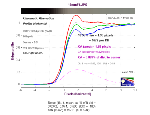 从18mm全开光圈时的镜头边缘水平与中心垂直方向的色散来看,水平方向的色散为1.28像素,垂直方向的色散也仅为0.274像素。色散区域的像素均在可以接受的范围之内。