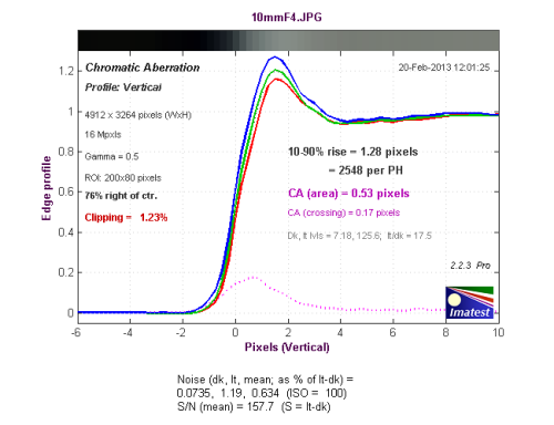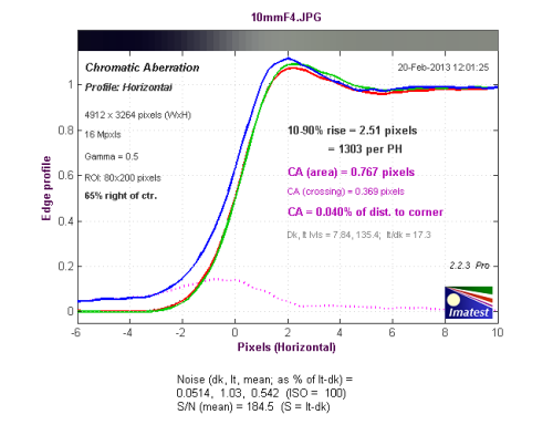 从10mm全开光圈时的镜头边缘水平与中心垂直方向的色散来看,水平方向的色散为0.767像素,垂直方向的色散也仅为0.53像素。色散区域的像素均在可以接受的范围之内。