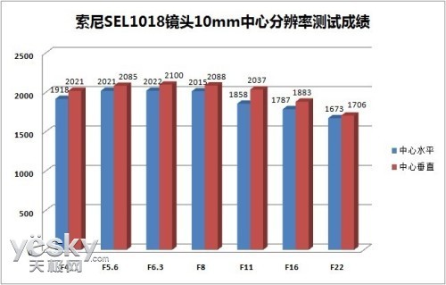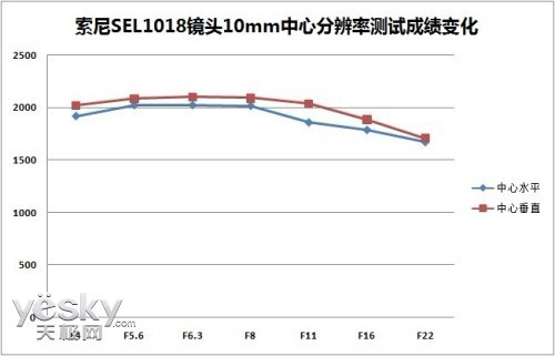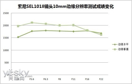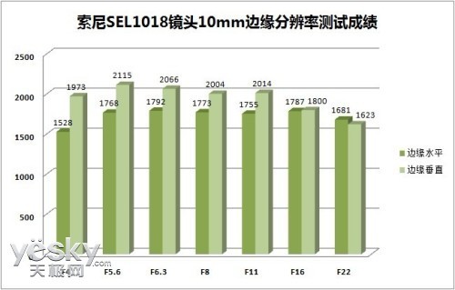从10mm焦段的中心分辨率测试情况来看,在各档光圈下,分辨率基本保持在1600水平线上。最高成绩在光圈开到F6.3时中心垂直超过2100。从整个10mm中心分辨率测试成绩来看走势还不错,最佳光圈出现在F6.3。