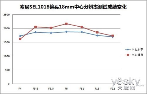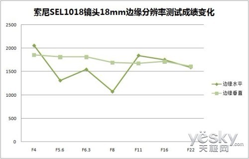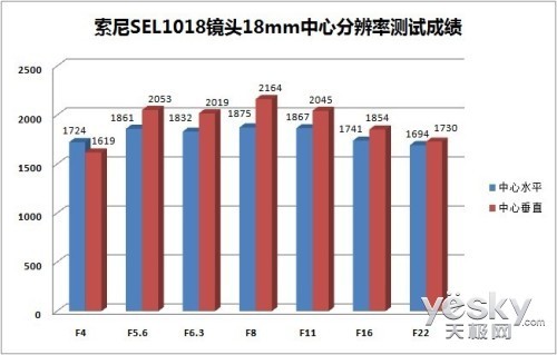 从18mm焦段的中心分辨率测试情况来看,在各档光圈下,分辨率基本保持在1600水平线上。最高成绩在光圈开到F8时超过2100。从整个18mm中心分辨率测试成绩来看走势还不错,最佳光圈出现在F8。