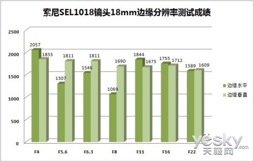 从18mm焦段镜头边缘分辨率测试成绩来看,各档光圈整体的边缘水平分辨率水平起伏较大,峰值出现在光圈F4时。从边缘垂直分辨率上来看,峰值也出现在光圈F4时,已经接近1900线。总的来看,F4光圈为最佳光圈。