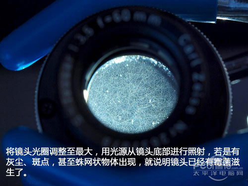 我们可以通过下面的办法查看镜头是否有霉菌,将镜头光圈调整至最大,让光最大限度通过,此时用光源从镜头底部进行照射,若是有灰尘、斑点,甚至蛛网状物体出现,就说明镜头已经有霉菌滋生了。