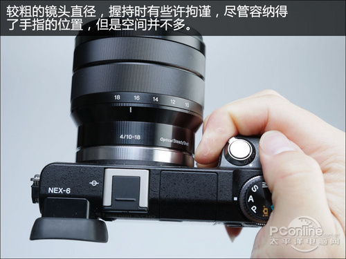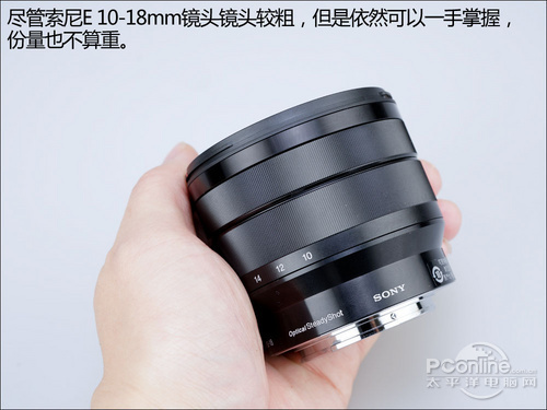 绝对值方面索尼E 10-18mm F4 OSS镜头也许体积不算大,但是装上机身后,握持时就有点压力了,镜头与手柄之间的空间被压缩,好在还未影响到正常握持。当然这也是因人而异,手大的人也许就有压力了。