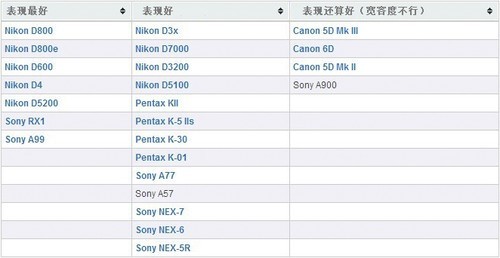 名单生剩下的机器令我很意外。首先,大部分都是尼康的机器,D4/D800/D600都是大好的机器,这不稀奇,坑爹的是名单上还有一大票尼康APS机 器,而佳能APS一台也没有。佳能目前在产的传感器都是需要升级的老款了,但是这样的结果还是让我意外。不过这几个佳能机器我都用过,我知道它们同样能满 足我的需要,所以我不把它们几个除名。