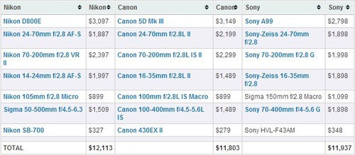 我先粗略算一下,包括各家的全画幅机身和这些镜头:24-70/2.8、70-200/2.8、100或150mm微距、恒定2.8广角变焦、高画质的望 远镜头。我还想要一个稍微有一点广角的大光圈定焦,八成会是适马35/1.4,所以我的实际花费会比列表上多899美刀。另外我还会配个中级的热靴闪光 灯。