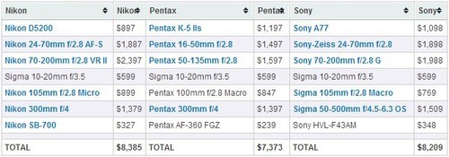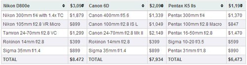在我横向比较系统的时候,也会看它们的花费对比,我很清楚相机的价格,但是不清楚整套系统的花费。(你们肯定觉得器材价格应该随时在我脑袋里听候调用,但其实我已经有两年没经手Lensrentals的采购工作了)