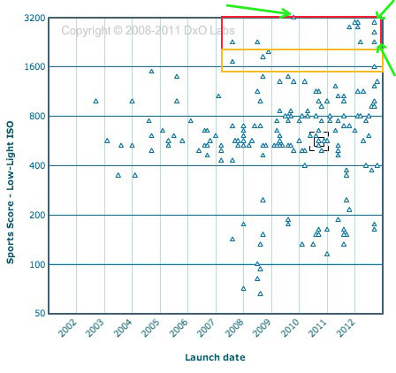 要是你嫌麻烦,可以把这个表简单的理解为相机的最高可用感光度。DxOMark的好处是可以按发布时间显示机型,所以我们可以看到至今仍没有机器能超过D3s(顶端绿箭头指的那个)的高感表现。常用到高感的,在二手市场上找台D3s也是个不错的选择。