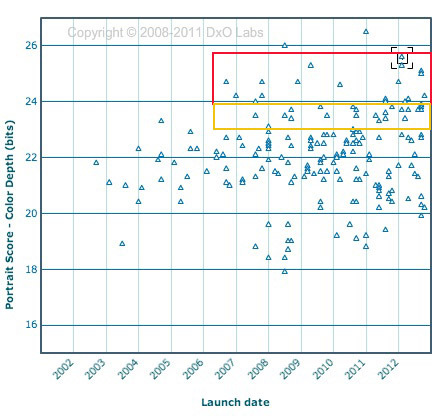 传感器总得分是一个非常主观的东西,我是不认为那么多复杂的因素可以用一个数字表示出来。但是我觉得色彩深度、动态范围、高ISO三个项目的得分是相当有 用的。我要强调一下,我不是在比哪个相机的得分最高,那是各家枪手和脑残粉的事。我是用来选相机,圈定一个符合我需要的范围,然后做其他功课。