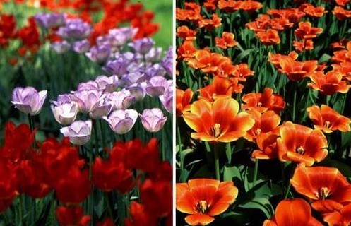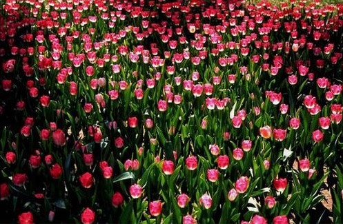 在“郁金香”的插图中,有三幅照片各用不同的镜头拍摄,分别有不同的视觉效果。上图使用超广角镜头拍摄,营造大面积的空间感,树林中的光照有明有暗相互呼 应。左下图,用不同的花色相互衬托对比,在前后红色郁金香的烘托下,显得浅紫色的郁金香更为亮丽。同时,利用180毫米长焦距镜头景深小的特点,虚化前后 红色的郁金香,更加突出作为主体的浅紫色郁金香。右下图虽然拍摄的都是同品种的郁金香,但是镶金边的花朵从单一色调中脱颖而出,作为主体十分醒目。