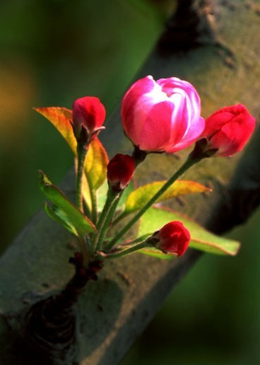 “海棠”是用微距镜头拍摄的特写。拍摄前经过反复的观察和斟酌,最后选中这几枝从树干上萌出的花蕾,呈放射状的花蕾错落有序,而且开放的程度各不相同。 拍摄时,遵循对角线构图的原则安排画面。再将焦点放在最大的花蕾上,其他花蕾和树叶都在景深范围之外,不同程度地被虚化,有利突出主体。