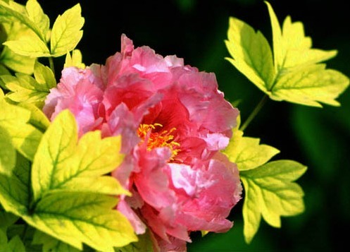 “牡丹”这幅照片是花和叶子配合的一个例子。利用牡丹花周围浅绿色的叶子作为陪衬,使它们能从背景中大面积深绿色的叶子中跳出来。右侧的两片叶子形态也很 好,使整个画面显得活泼。此外,很多人在拍摄花卉时,喜欢随身带一只喷壶,以便随时向花上喷水——人造露水。但是水喷多了,往往会弄巧成拙适得其反,我觉 得还是顺其自然为好。