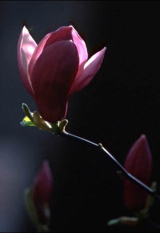 另外,花卉摄影还应该注意不同胶卷的宽容度也是不同的,特别是彩色反转片的宽容度比较小,曝光时要特别小心。而且不同的专业彩色反转片,其特性是完全不同 的,选用时一定要加以注意。强烈的光线形成高光比,如果超出胶卷的曝光宽容度,会造成不是损失高光部位,就是丢失暗部的细节,难以两全相顾。例如,“紫玉 兰”那张照片是使用彩色反转片拍摄的。由于光比较大,测光时首先考虑到亮部花瓣的层次感是重点,其次又要适当照顾暗部起陪衬作用的两只花蕾,所以测光时主 要参考玉兰花高光部位的亮度。如果按照花的暗部为测光依据的话,一则亮部的花瓣很可能就会曝光过度,失去应有的层次;二则后面的两只花蕾会过于抢眼冲淡主 体,两者都会使预先的设想落空。