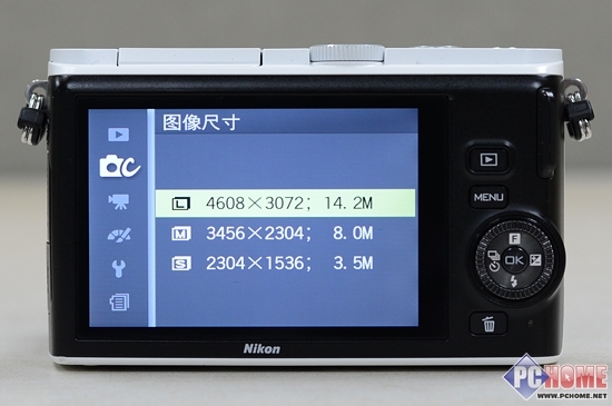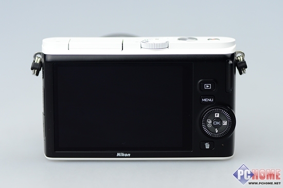 尼康J3机身的背面依然延续着上一代产品采用的是3英寸92万画点LCD屏幕,在按键布局上有明显改动,大拇指处减去了防滑胶皮,没有模式拨盘,如果减去了模式拨盘是为了当大拇指更为舒适的话,那么胶皮的减去让我多少有些失望的,甚至给两根防滑条也行啊,其次F功能按键也省去了,直接在模式拨盘里的最上面选项就可以进入修改拍摄模式,这个模式拨盘的材质真的不错,使用的是金属转盘在寿命上相比有些塑料的转盘在耐久性上可以用的时间更长,操控拨转时有明显顿挫感,另外从原先的4个按键减去了1个DISP信息按键。