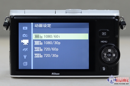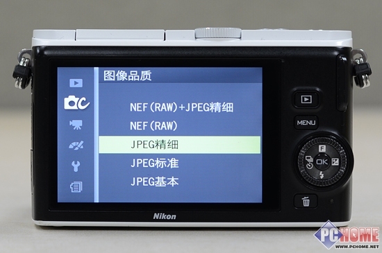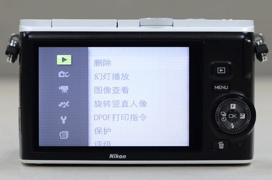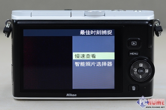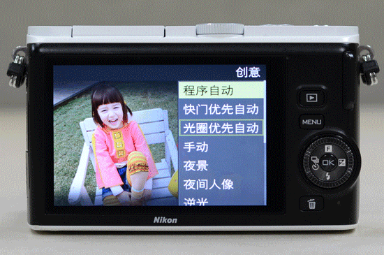在选择模式拨盘的F功能按键相比上一代产品J2,不在是粗略的一大串P、S、A、M字母选项,以前就算你选择了P、S、A、M选项还是要进入MENU菜单进行模式切换,而那时的F按键只起到了记录的作用,并没有真正达到拍摄功能的快速切换,仅字母的选项让刚玩摄影的入门级学者绝对是一头雾水,如今尼康再次细分了选项,也配入了中文字幕,通过F功能按键就能一次性找到自己所需要的拍摄模式,另外在F功能按键里也和滤镜模式功能捆绑在一起,无需通过两个切入口进入,配合图文玩家很容易就能上手。