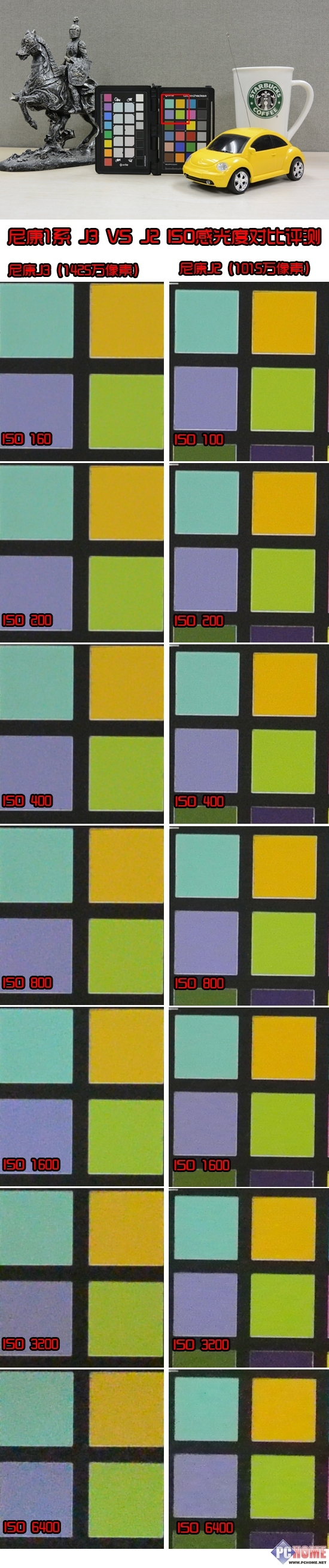 颗粒感和伪色最重的绝对要属ISO3200至6400了,无论是尼康J3还是J2在黑色线条区块都有明显绿白伪色的介入,整体画面开始变得不清晰,经过本次测试我们可以看出尼康J2在低感上相比尼康J3还是较有一定的优势,但是从ISO200开始至6400并没有感觉有什么太大区别。