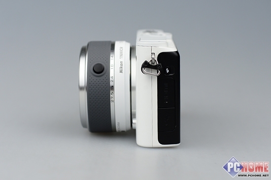 机身左侧从这个角度看上去很明显能感觉到尼康J3相比J2和J1要薄了很多,尼康J3机身左侧有一个闪光灯开关按键,而J2和J1则放置在机身背面的左上方,背带扣环的设计尼康J3和P7700卡片机几乎一样,这个扣环我觉得没有尼康J2和J1来的好,长时间震晃后黑色塑料扣容易摩擦至机身漆面。