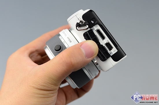 位于机身的左侧配有HDMI接口以及USB接口,并没有像尼康V2一样配备MIC麦克风接口有那么些遗憾。