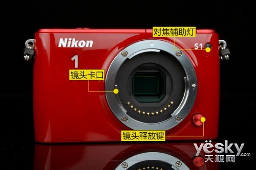 从外观上看,S1圆润的机身四角让相机整体看上去显得非常可爱,抛光的表漆让机身色彩更显靓丽。从时尚角度而言,S1是一台能让大多数人所喜欢的产品。好了,言归正传,S1机身正面分布了镜头卡口、镜头释放按钮和对焦辅助灯。