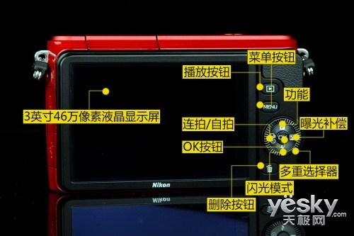 S1机身背面的按钮布局与J系列的如出一辙,与尼康COOLPIX系列产品的布局也有所类似。这样做的好处是让操作变得简单,让没有接触过的人也能够快速的使用这台相机。这完全符合尼康对于S1针对入门级用户的定位。