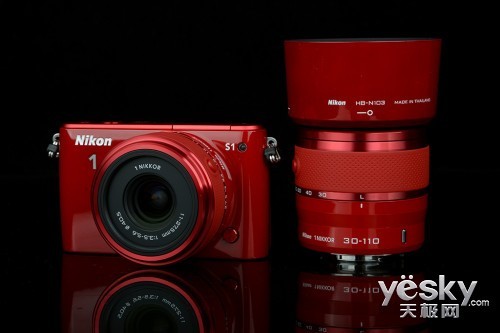 尼康为S1提供了黑色、粉色、红色、白色和卡其色这五种颜色,本次到达我们评测室的为艳丽的红色。尼康的色彩做的比较彻底,连套机的镜头都是与机身一个颜色的,更加凸显其个性。