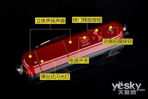 机顶的表面采用了拉丝金属处理,与机身其他部分不同,为整台相机增添了一丝科技感。而这里也安排了比较常规的闪光灯、立体声麦克风、电源开关、快门按钮和摄像按钮。
