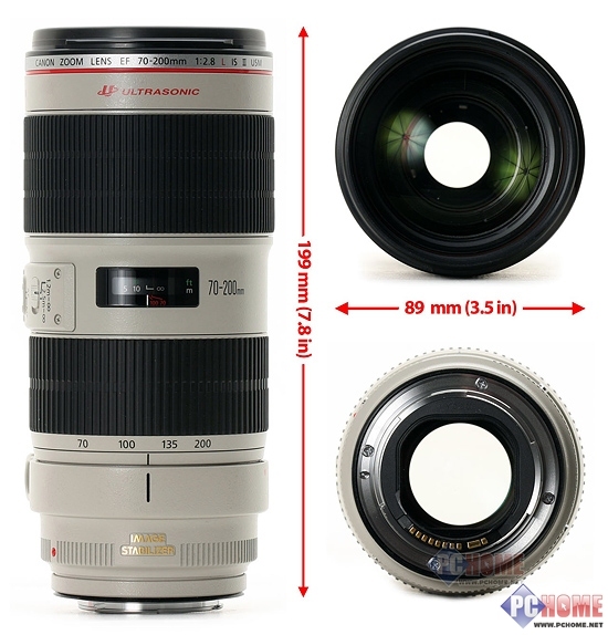 佳能EF 70-200mm f/2.8L IS II USM 199mm的长度相比前代长了一块UV镜的距离,同时外型也壮硕许多。但是好在镜头接环仍旧保持了77mm的口径,不会影响到用户原先所使用到的各种滤镜。
