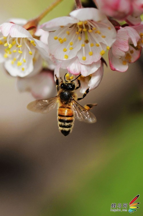 如果拍摄樱花时有蜜蜂飞过,动与静同时在取景框中出现,这绝对是可遇不可求的情况。这样的机会转瞬即逝,同时还要平衡动与静更是很困难的事情。这时对焦是 第一位的,尽量使用中央对焦点,并采用连续对焦与连拍模式。一定要保证主体的清晰成像,这样一来就算构图不理想,还可以在后期进行二次构图。