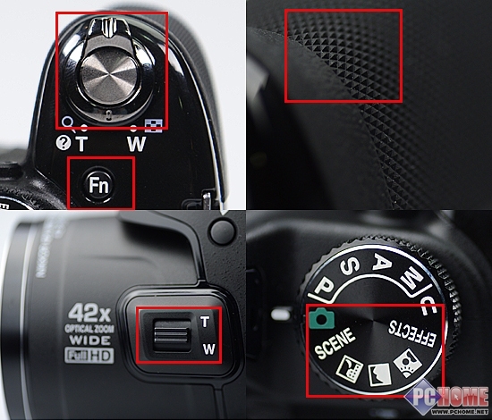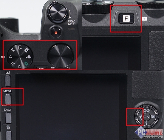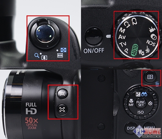 佳能SX50 HS主要通过快门按键的拨杆进行变焦,机身顶部也配备趣味性很强的模式拨盘、在镜头左侧设有构图辅助按钮,这两个按键主要是为长焦相机而设,它可以帮你记录之前所设置拍摄的焦距,方便你在拍摄时广角端和最远端实现一个快速切换。机身背面需要通过独立的对焦按键来移动对焦点位,这一点依然延续着佳能相机的风格。