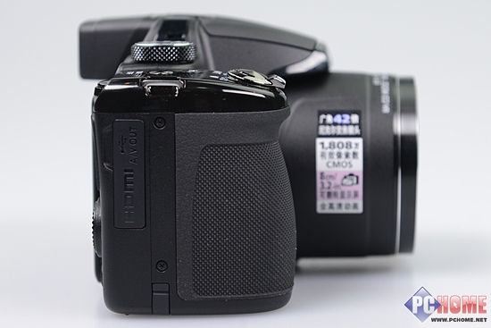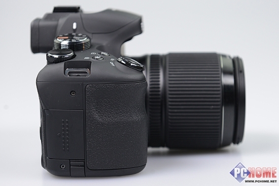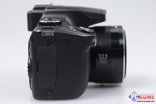 佳能SX50 HS属于长焦数码相机,从机身的右侧来看,整体的线条感相比以上几款单反、微单都更具有艺术线条美感,唯一不足的就是手持处居然没有搭配任何的橡胶蒙皮,因此手持感也是本次横评相机中最差的。