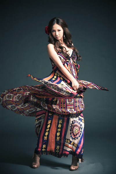 除了柔光的拍摄外,棚内拍摄的另一个主流就是对比光的拍摄,而这类对比光用最多的情形,就是在背景纸上。下面这张照片是很标准的棚内背景纸打光作品。在这 边,我们用了四支灯,一支是位于模特儿头上,打出主要影子的主灯;一支是在模特儿正面,加了透射伞的正面补光灯;我们也用了另一支灯打亮背景,让它不会太 暗,也多一些层次;最后,我们在模特儿脚上再加一支蜂巢灯,用来制造地上的光点,便完成了这张照片。其实拍背景纸不难,重点是模特儿本身的动作扎实度,和你打灯时的所要表现的重点是什么。