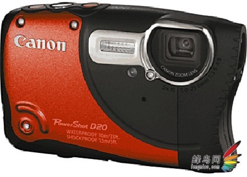 去年年初,佳能发布了旗下三防产品——佳能D20。该产品独特的造型吸引了众多人的关注,其尺寸为112×71×28mm,包含电池的重量约为 228g。机身背部设计了3英寸的46万像素的LCD液晶显示屏。(据佳能(中国)官网消息,该产品并未在中国地区销售,不过经笔者查询,其在淘宝网有 售,参考价格为2000元人民币左右。)