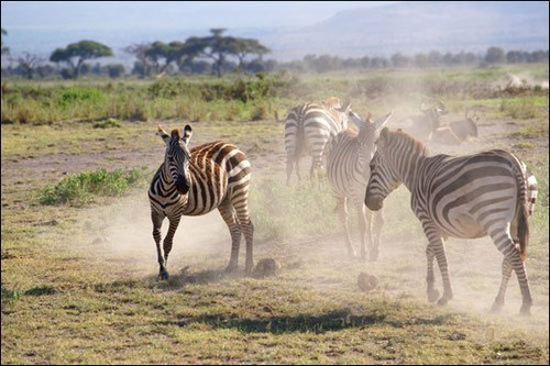 拍摄静态动物画面时可用光圈优先模式。捕捉动物动态画面时,为了达到最理想的动态效果,可以使用快门优先模式。在拍摄动态题材的照片时,要注意对焦的准 确。对于动作缓慢的动物,对焦不成问题,而对那些动作迅速的动物而言,对焦就比较困难了。可采用跟踪对焦的方法来快速抓拍动物的动态形象。除了跟踪对焦、 连拍模式这些需要注意的相机设定以外,高速同步闪光等技法也可以根据需要应用到动物摄影当中。对“动”的刻画还可以采用对比的手法,如果能在画面中找到衬 托主体的陪体,利用动静对比的手法,无疑能够增强画面的表现力。此外,对“动”的刻画也可以通过一些细节来体现。在本例中,斑马群开始骚动,虽然画面没有 捕捉到斑马运动的形态,但马蹄扬起的灰尘仍然使画面充满了动感。