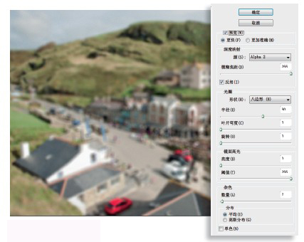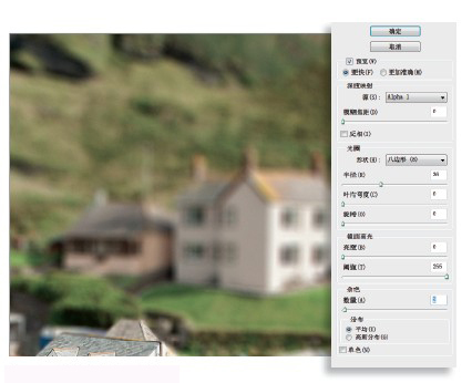 打开光圈形状下拉菜单,将其设置为八边形,接着将半径设置为3。使用快捷键Ctrl+ +放大预览画面,以便清楚的观察后方的模糊画面,将杂色数量设置为2。