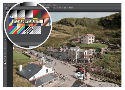 单击打开图像按钮进入Photoshop,选择渐变工具。使用快捷键D将前景色与背景色复位为黑白。在上方选项栏中单击渐变条带打开渐变编辑器,选择第一预设“前景色到背景色渐变”。接下来将渐变方式设置为对称渐变。