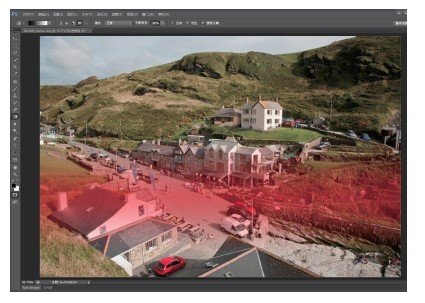 使用快捷键Q进入快速蒙板模式,工具栏最下方的快速蒙板图标将变为选择状态。在快速蒙板模式下,我们绘制的所有黑色内容均会在退出后变为选区。从对面道路商铺的雨阳棚到路边停着的红色小车创建一条渐变线。