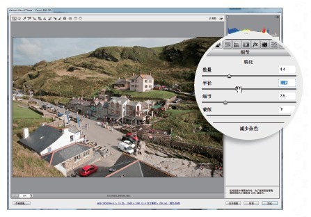 显然我们不希望对模拟移轴效果进行模糊之后的照片进行锐化操作,所以目前是执行锐化的最佳时机。双击上方工具栏中的缩放工具图标将显示比例设置为100%,进入细节面板,将锐化数量设置为44,半径设置为1.4。
