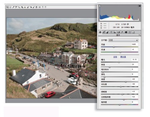在Adobe Bridge中找到这张俯拍的照片,右键单击,从弹出菜单中选择“在Camera Raw中打开”命令。在基本面板中将色温设置为5400,曝光-0.15,恢复23,填充亮光5,黑色9,对比度30,清晰度+15,自然饱和度+23。
